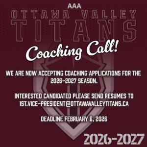 The Ottawa Valley Titans AAA Minor Hockey Association are seeking qualified coaches to join the organization for the 2026-2027 season. Interested candidates should send their application or enquiries to: 1st.vice-president@ottawavalleytitans.ca Coaching experience, or significant playing experience; coupled with strong communication & organizational skills will be highly regarded. Candidates must be willing to show a high…